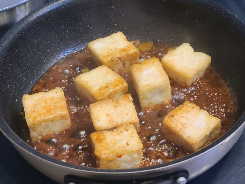 간장 설탕 굴소스 올리고담 물 조금 넣고 바글바글 끓으면 구운두부 넣고 조리면 완성