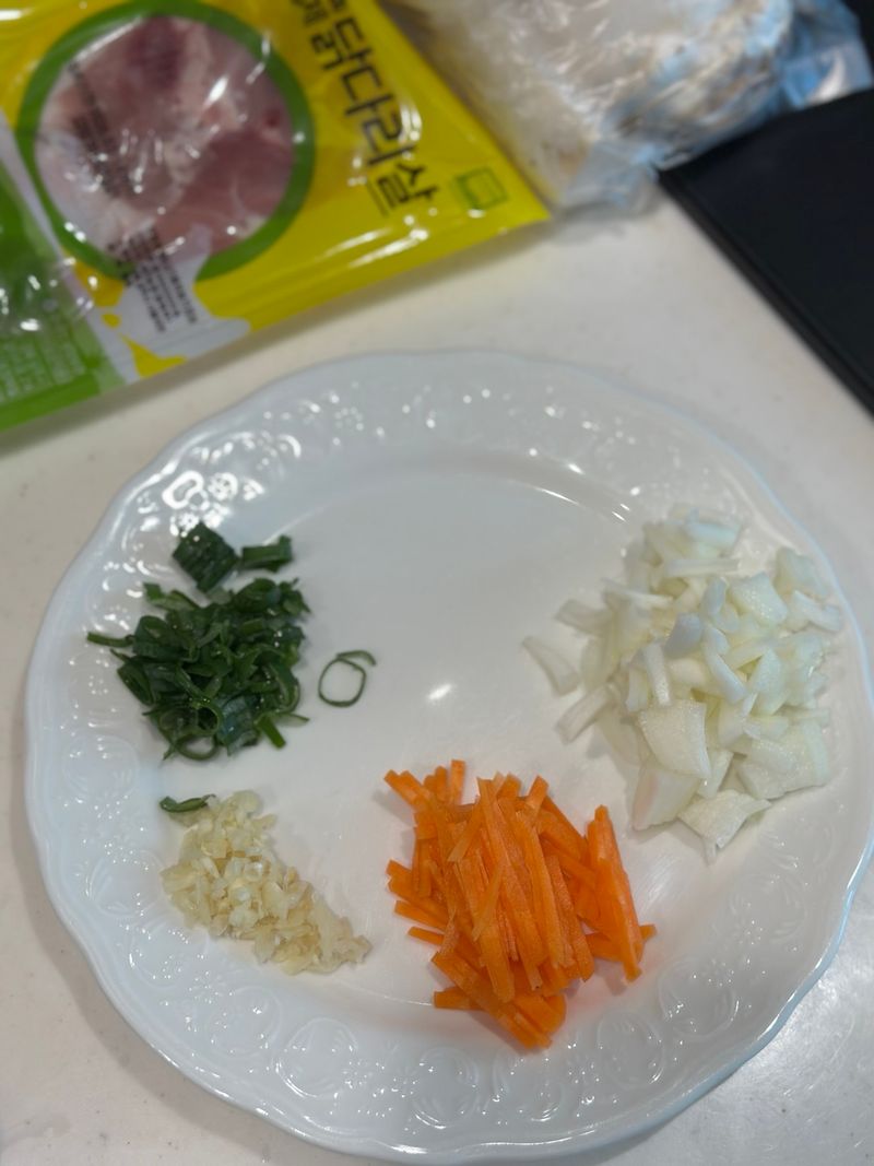 파, 마늘 다지고, 당근과 양파도 잘게 잘랐어요.