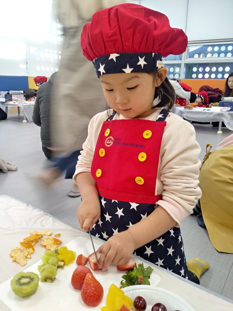집중해서 과일을 썰어봅니다. 나만의 케이크만들기 프로그램에 참가 요리하는 모습을 담았습니다. 요리가 집중력과 창의력에 매우 도움이 됩니다.