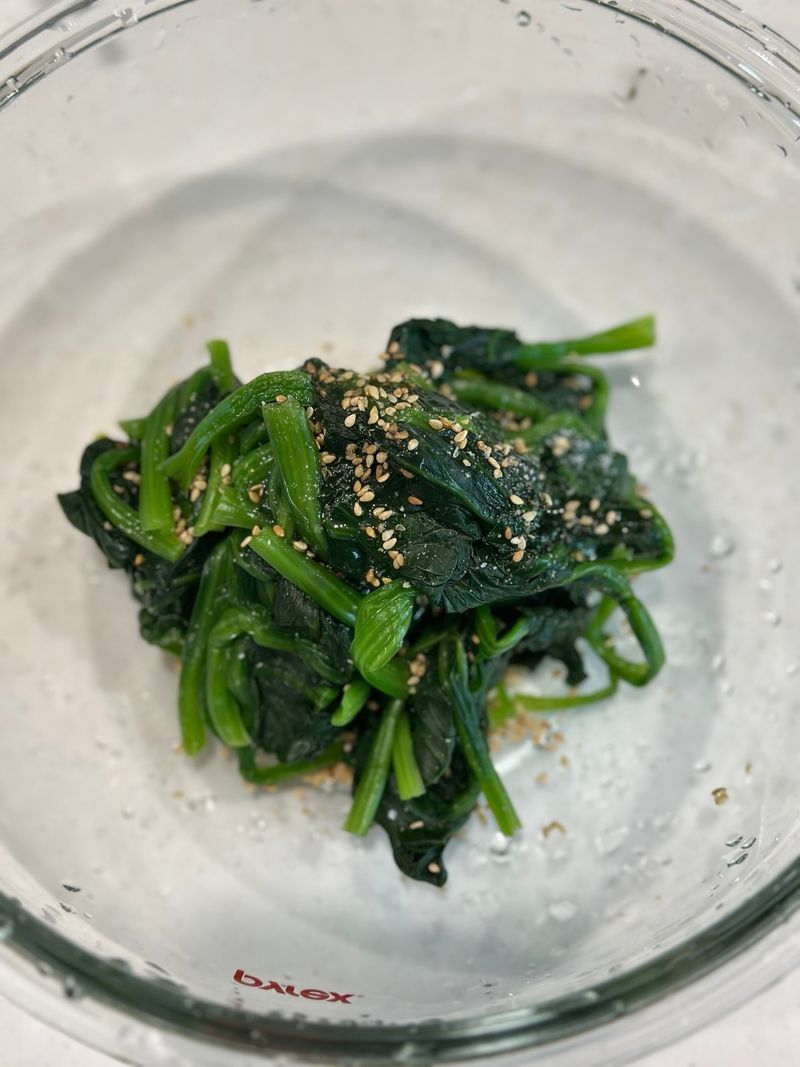 연두 + 참기름 + 깨 넣고 조물조물 무치면 너무너무 맛있는 시금치무침 완성이요.