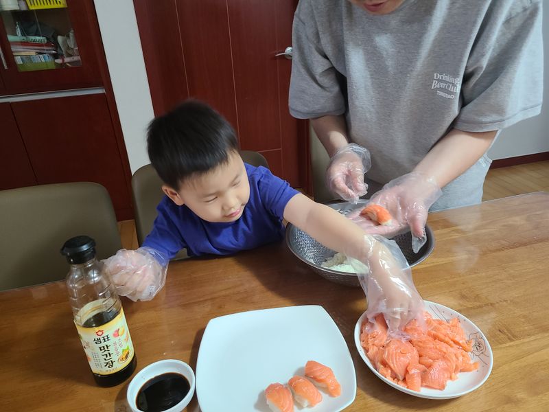초밥을 만들어 그 자리에서 서로 먹어주기도 하면서 아빠와의 관계도 더 돈독하게 할 수 있어요. 심심한 주말에 게임만 할 것이 아니라 온 가족이 함께 식사를 만들어 보면 어떨까요?