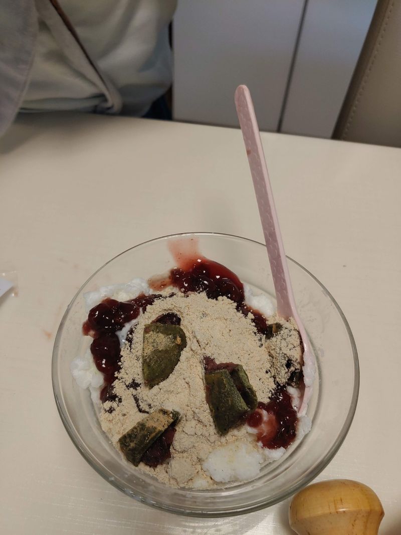 3. 준비해 둔 팥과 콩가루, 떡을 올려서 맛있게 먹으면 끝 !