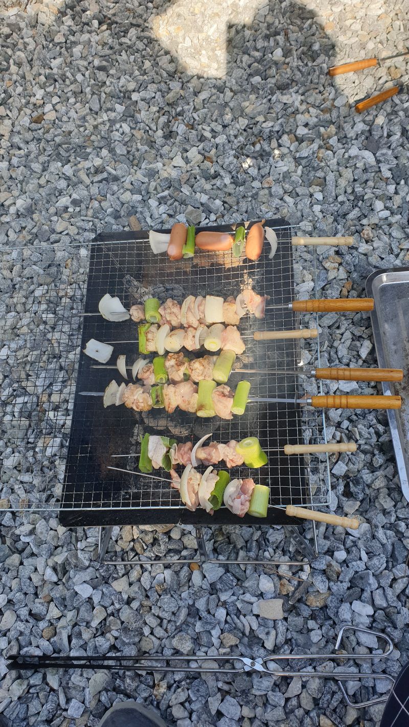 아침에 일어나 닭꼬치를 만들었어요 부스스까치머리로 열심히열심히 숯불에 노릇노릇 맛있게 구워먹어요 디저트는 달콤한 달고나♡ 엄마아빠는 우리가 만들어 더 맛있데요~