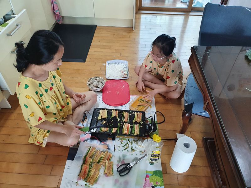 제사가 있는날 첫째가 음식중 한가지를 해보고 싶다해서 고기산적을 해봤어요 쪽파 소고기 새송이버섯 맛살 햄 이렇게 꼬지에 끼우고 부침가루 뭍히고 계란물까지 딸이 도와주네요 엄마는 굽고 하니 금방 전하나 끝냈네요 ~^^ 자다음 동그랑땡도 해볼래 하니 허리가 아프다고 눕방하러갔어요 ㅎ