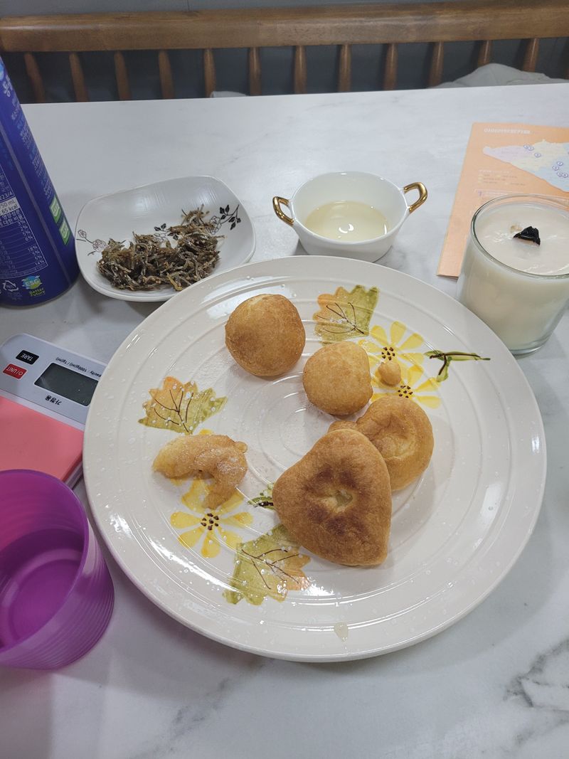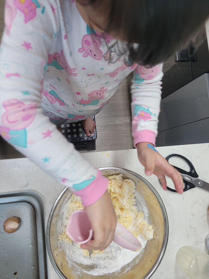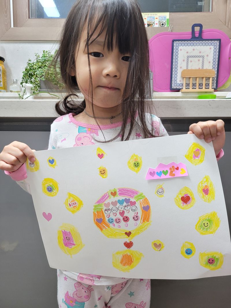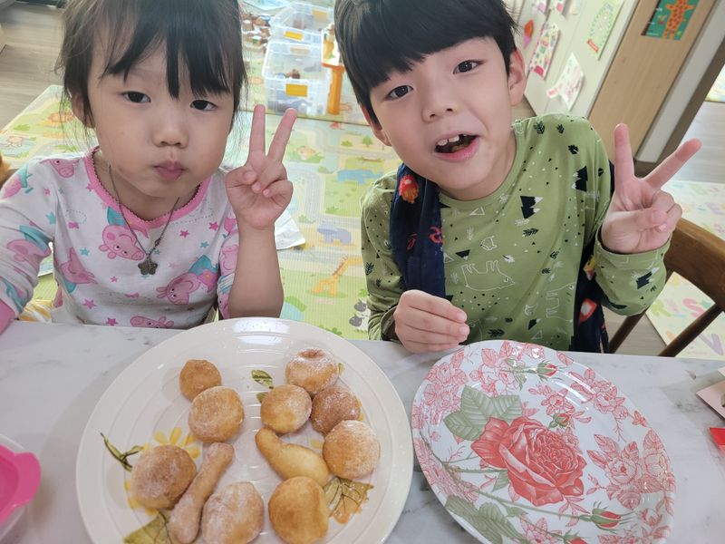 자고로 요리는.. 내복입고 내츄럴하게 하는거죠~😅 도넛믹스로 설명서읽고, 직접 반죽하고 먹어봤어요. 다먹고는 도넛그림도 스티꺼로 꾸미는 6세입니다.