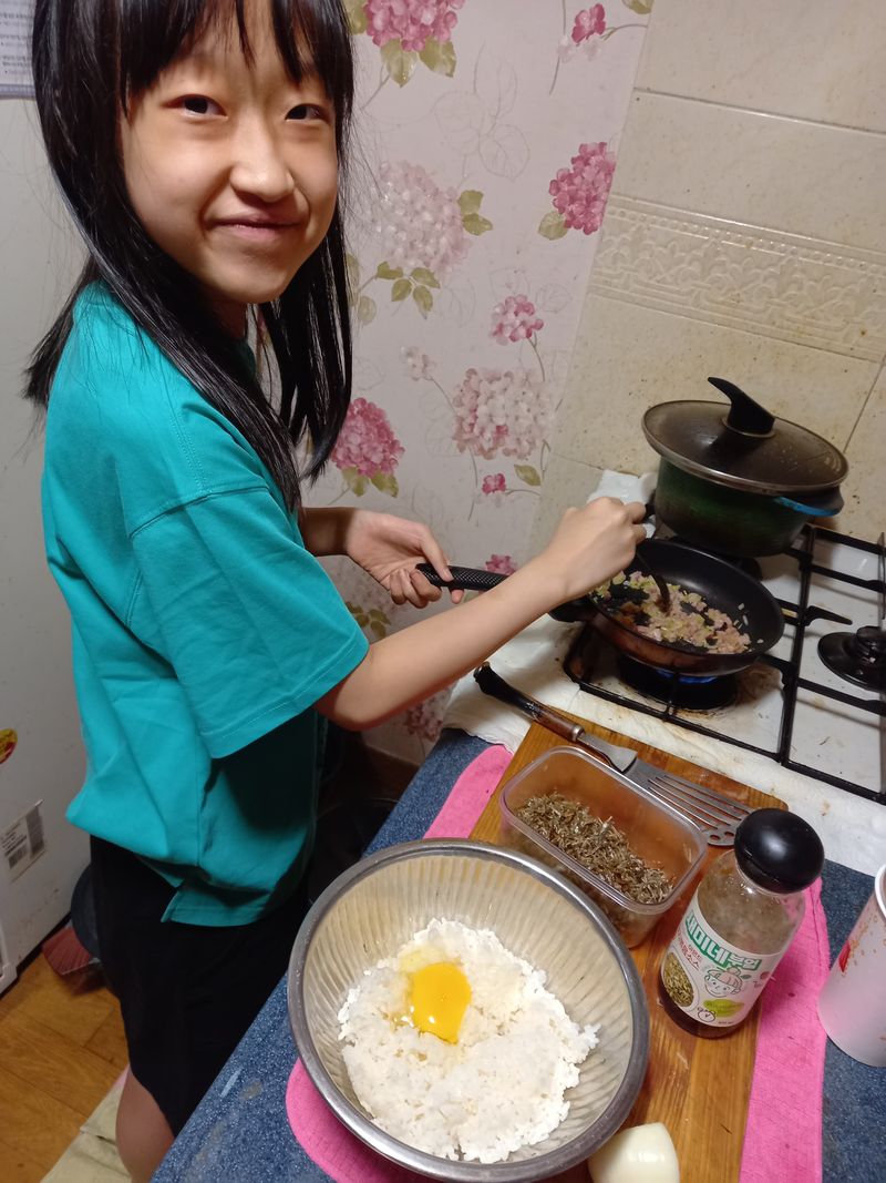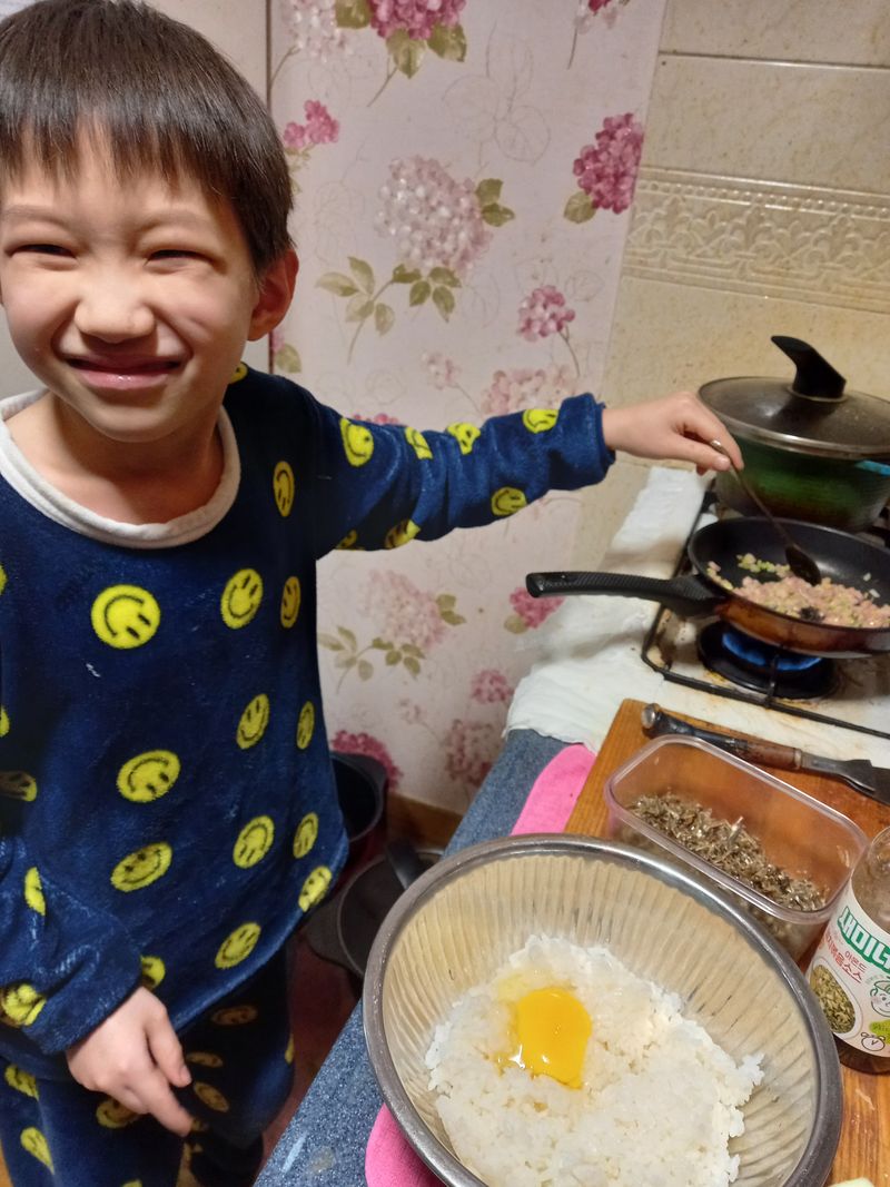 엄마의 된 밥 때문에 밥알이 데굴데굴 굴러다니자 아예 볶음밥으로 바꿔버렸죠.