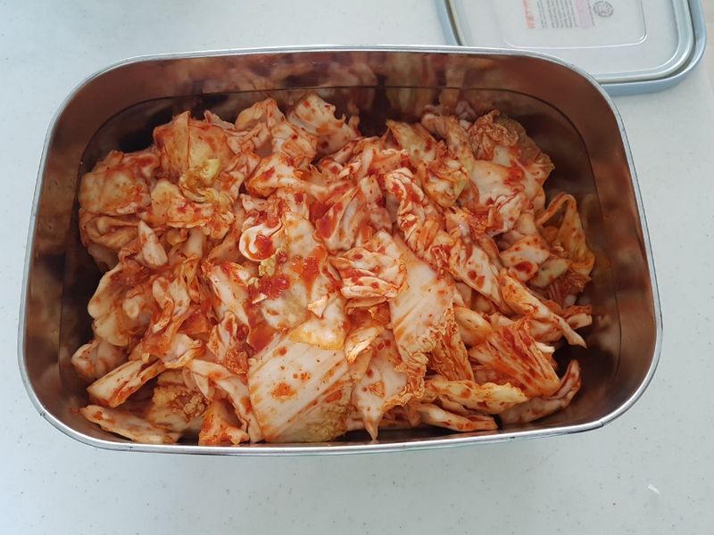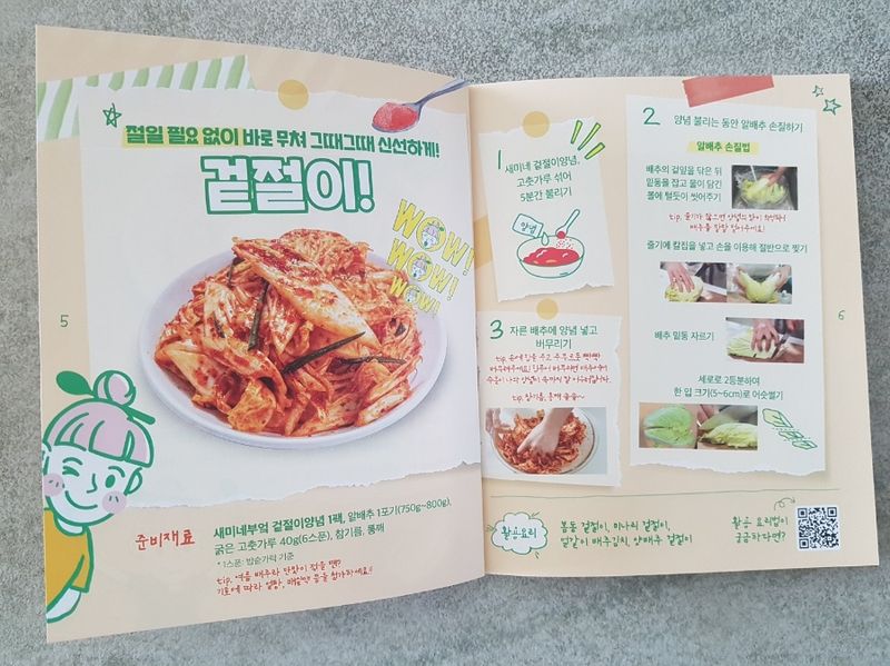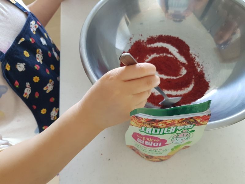 김치는 당연히 양가에서 받아먹거나 사먹는 걸로만 알던 제가 겉절이를 담근다니 스스로도 놀라웠는데요. 워낙 간단한 레시피라 반신반의하며 아이와 레시피북을 정독 후 비장한 각오로 요리를 시작했어요! 새미네 겉절이 양념과 고춧가루 6스푼을 섞어 5분간 불려두라고 되어 있는데, 저희 아이는 매운 김치를 잘 못 먹어서 3스푼으로 줄였어요. 그리고 알배추가 별로 없어서 양배추 반통을 추가했는데, 의외로 맛있어서 깜짝 놀랐답니다.