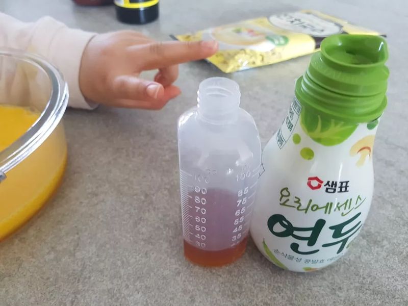 이번 계란찜의 핵심은 정확히 계량된 연두 20ml, 정확한 계량을 위해 약병까지 동원했으나 좀 더 많이 따라버린.... 하지만 어차피 물을 섞을 거니까 괜찮아요~^^; 연두가 많이 들어가면 더 맛있겠죠! ㅎㅎ 아이가 파와 연두를 섞으며 색깔이 더 선명해졌다고 신기해하더라구요. 이제 냄비에 중탕만 하면 계란찜은 끝!