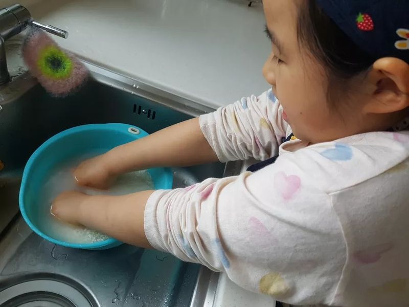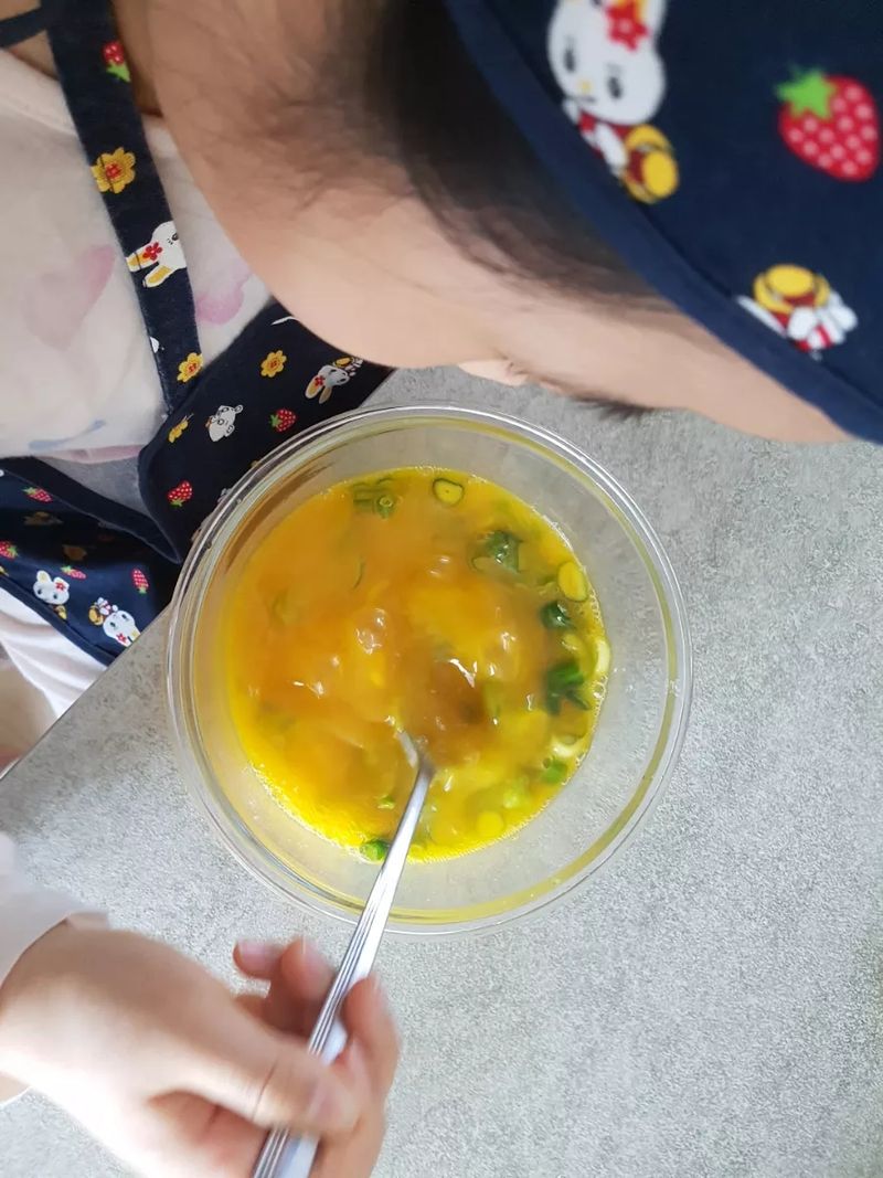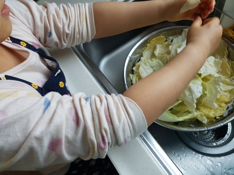 사실 저는 요린이라 할 줄 아는 음식이 별로 없어서 아이와 뭘 만들까 고민하다가 제가 가장 자신있어하는 계란찜과 맵지않은 겉절이를 만들기로 했어요. 아이는 엄마랑 요리를 한다고 신나서 앞치마와 두건까지 두르고 쌀부터 열심히 씻기 시작했어요. 평소에도 계란찜할 때 계란 풀기는 아이 담당이었는데, 이번에도 휘리릭 신명나게 섞어주더라구요~ㅋㅋ