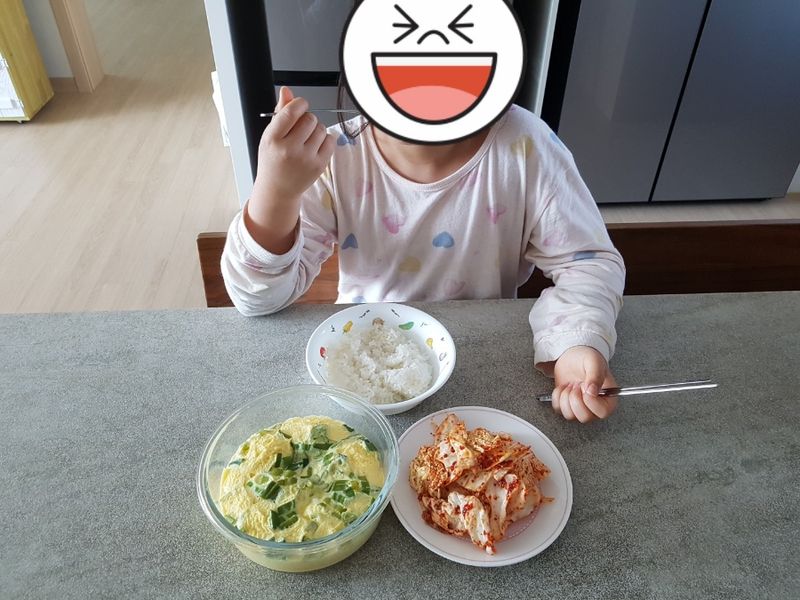 밥, 계란찜, 겉절이로 이루어진 단촐한 밥상이지만 모두 아이가 만든 거라 그런지 아이가 너무 뿌듯해했어요. 매운 거 잘 못먹어서 김치 안 좋아하는데, 자기가 만든 겉절이라 그런지 매운데도 맛있다며 열심히 먹더라구요. 게다가 연두가 마무리한 계란은 진짜 너무 맛있다고 엄지척했어요. 제가 평소에 했던 것보다 훨씬 더 맛있다며 계란 4개로 만든 건데 아이 혼자 거의 다 먹었네요.