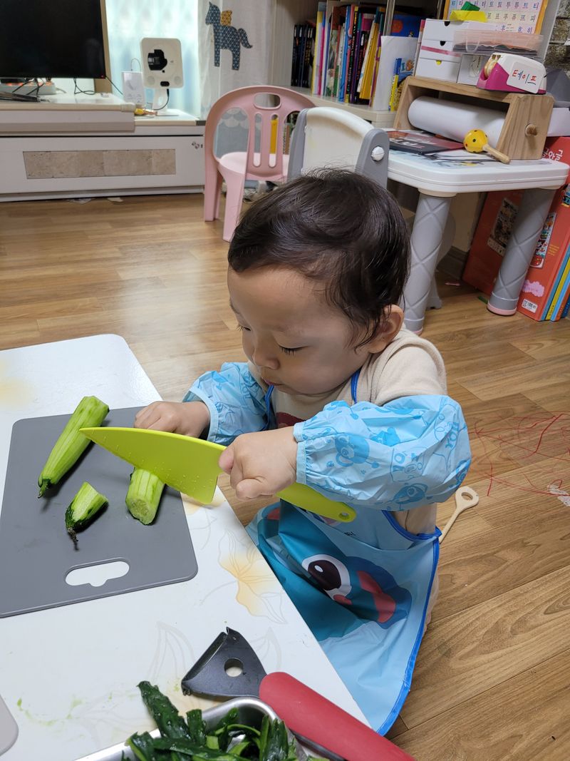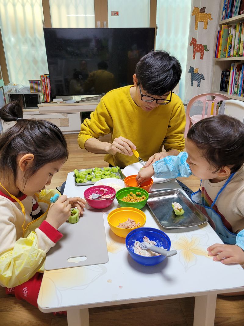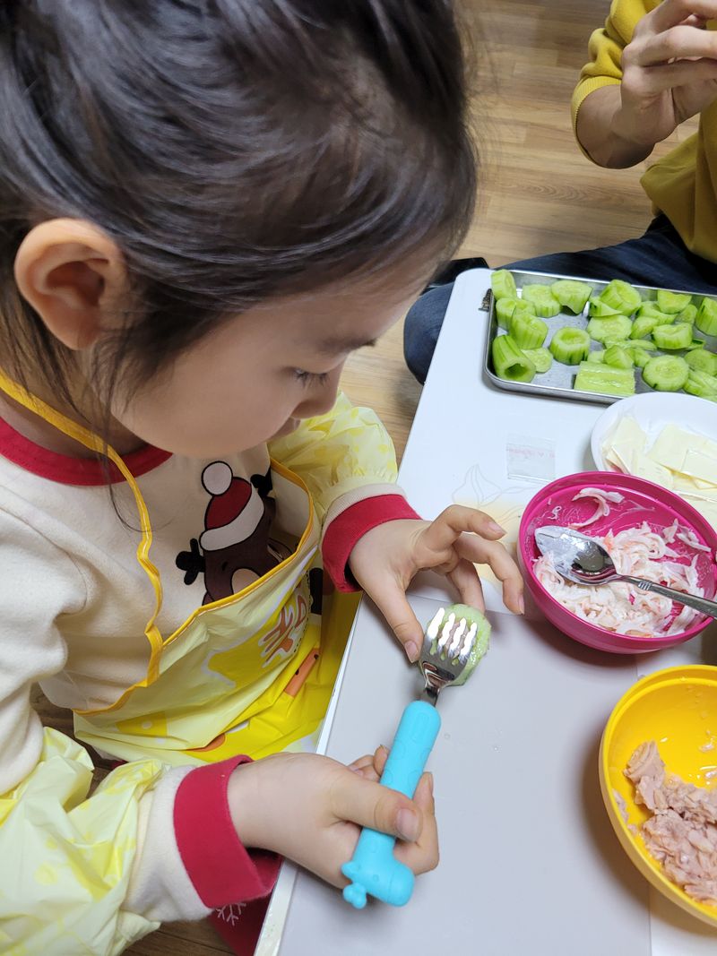 아빠랑 오이를 관찰하고 냄새도 맡아보고 파보기도 하고 부셔보기도 하면서 여러가지 토핑들을 준비해 올려봤어요~