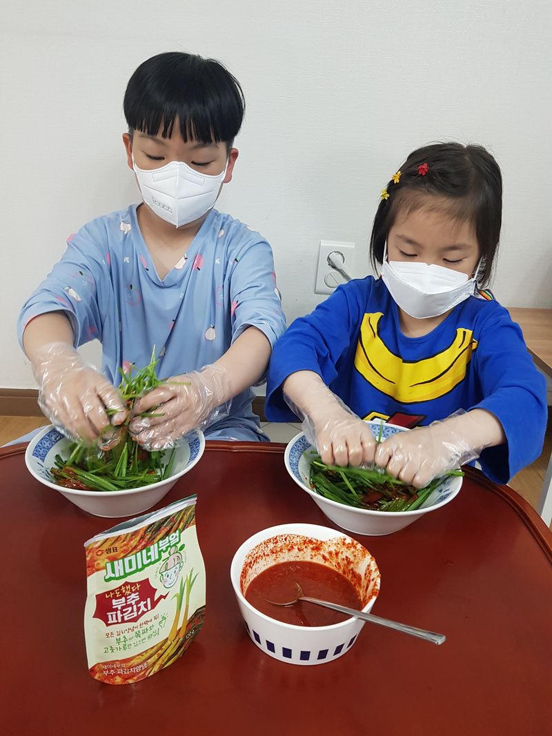 아이들이 좋아하는 부추로 부추김치를 만들었어요. 직접 양념해서 조물조물 무쳐 예쁜 그릇에 담으니 너무 먹음직스럽네요^^ 오늘 저녁은 함께 만들어 더 맛있는 부추김치와함께 맛있는 저녁을 먹겠습니다^^