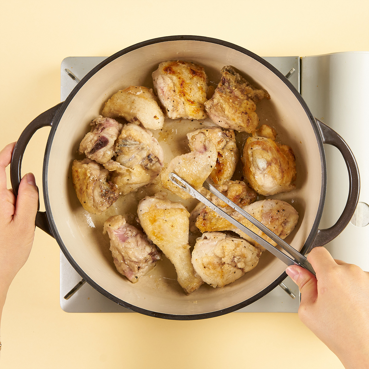 분량의 레드와인과 연두순, 부재료(타임, 월계수잎, 로즈마리), 구운 닭고기를 넣고 중불에서 30분간 끓여주면 완성!