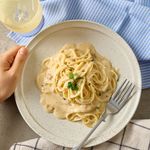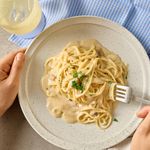 파스타 접시에 파스타면을 돌돌 돌려 담아주면 완성! 취향에 따라 후추와 치즈, 파슬리를 뿌려주세요.