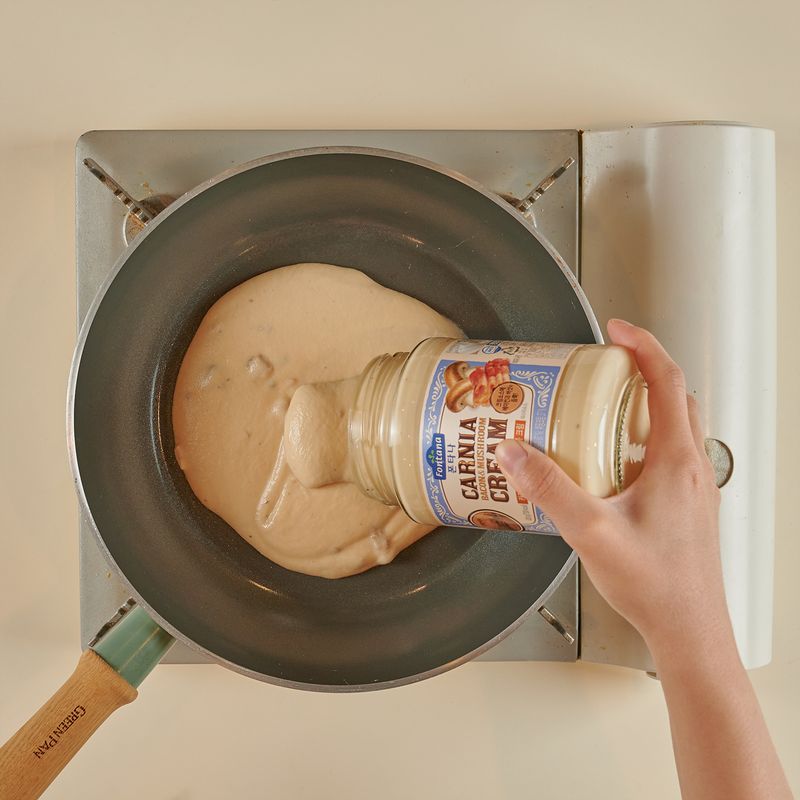 팬에 크림 파스타소스를 넣어준 후, 소스가 부글부글 끓을 때 삶은 면을 넣어 주세요. 면에 소스가 잘 묻어 나올 때까지 섞어주면 완성!