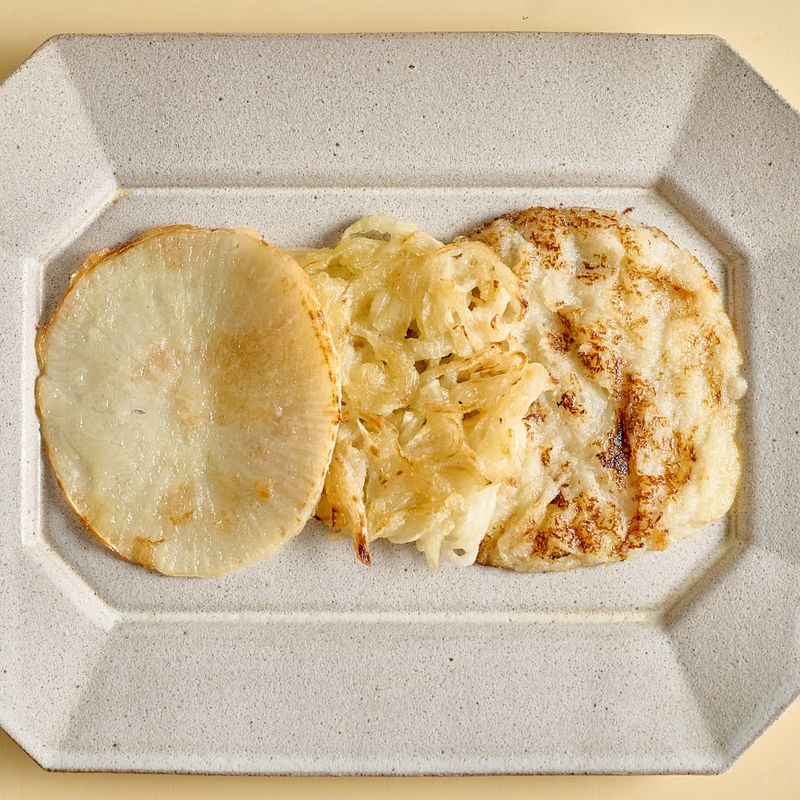껍질을 제거한 무는 0.5cm 두께로 얇게 원형 썰기해 주세요. 연두순(1.5스푼, 15g)을 넣고 5분간 절여주고, 튀김가루(1컵, 100g)에 물(8스푼, 80g)을 섞어 반죽을 만들어 절인 무와 함께 섞어주세요. 중불로 예열한 팬에 식용유를 두르고, 무를 하나씩 올려 앞뒤 30초씩 노릇하게 구워주면 완성!