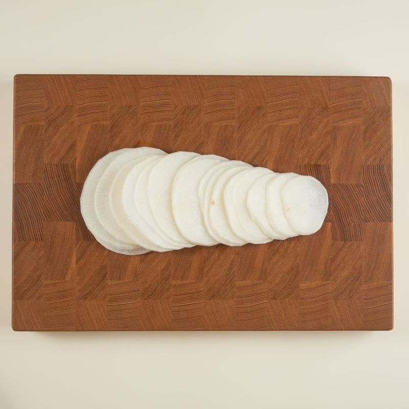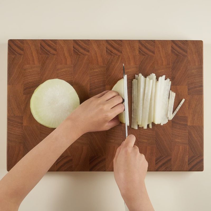 무는 흐르는 물에 겉면을 깨끗하게 씻은 후, 필러로 껍질을 제거하고 0.2cm 두께로 얇게 원형 썰기해 주세요. 썰은 무를 몇 장 겹쳐 다시 얇게 채 썰어주세요.