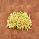 애호박은 깨끗이 세척하여 양끝을 자른 후 0.5 cm 두께로 얇게 어슷썬 후, 얇게 채썰어 주세요.