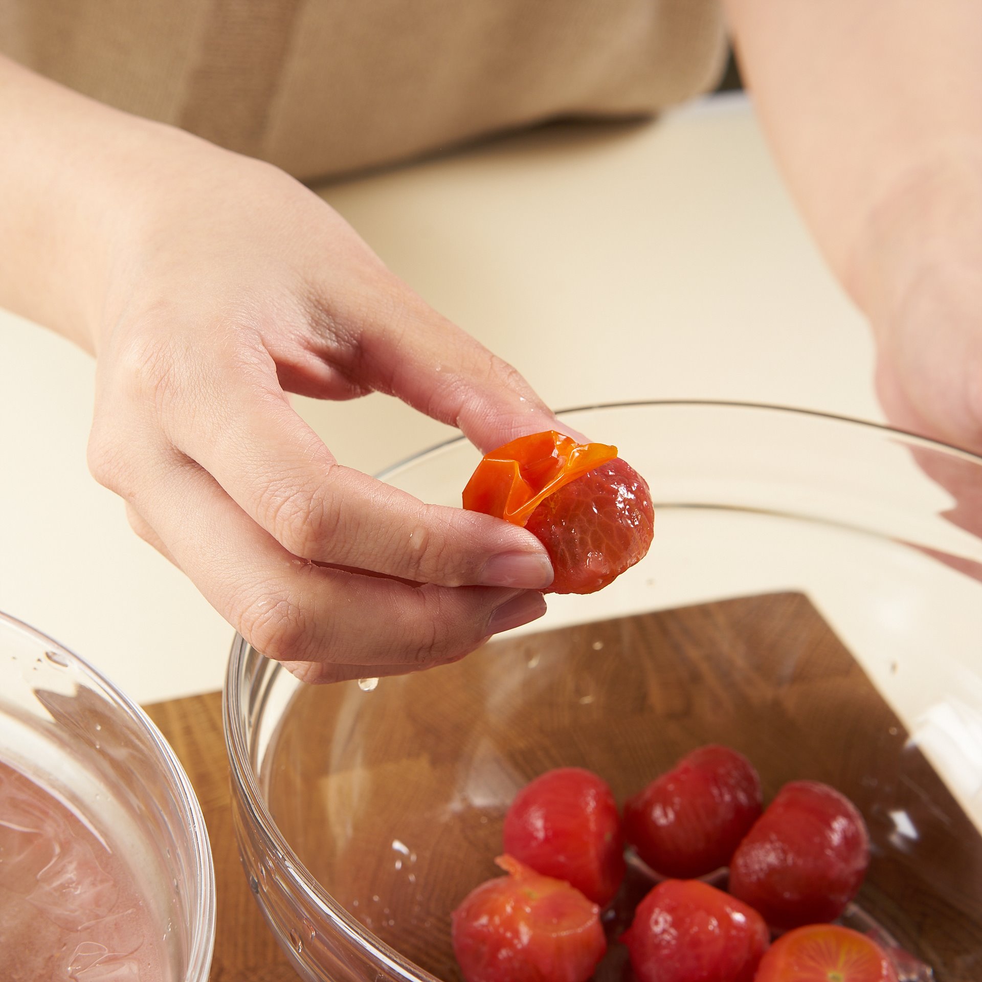 토마토는 밑동 부분에 칼집을 내거나 꼭지부분의 0.1cm 정도를 칼로 잘라 준 후, 끓는 물에 30초 정도 데쳐주세요.
