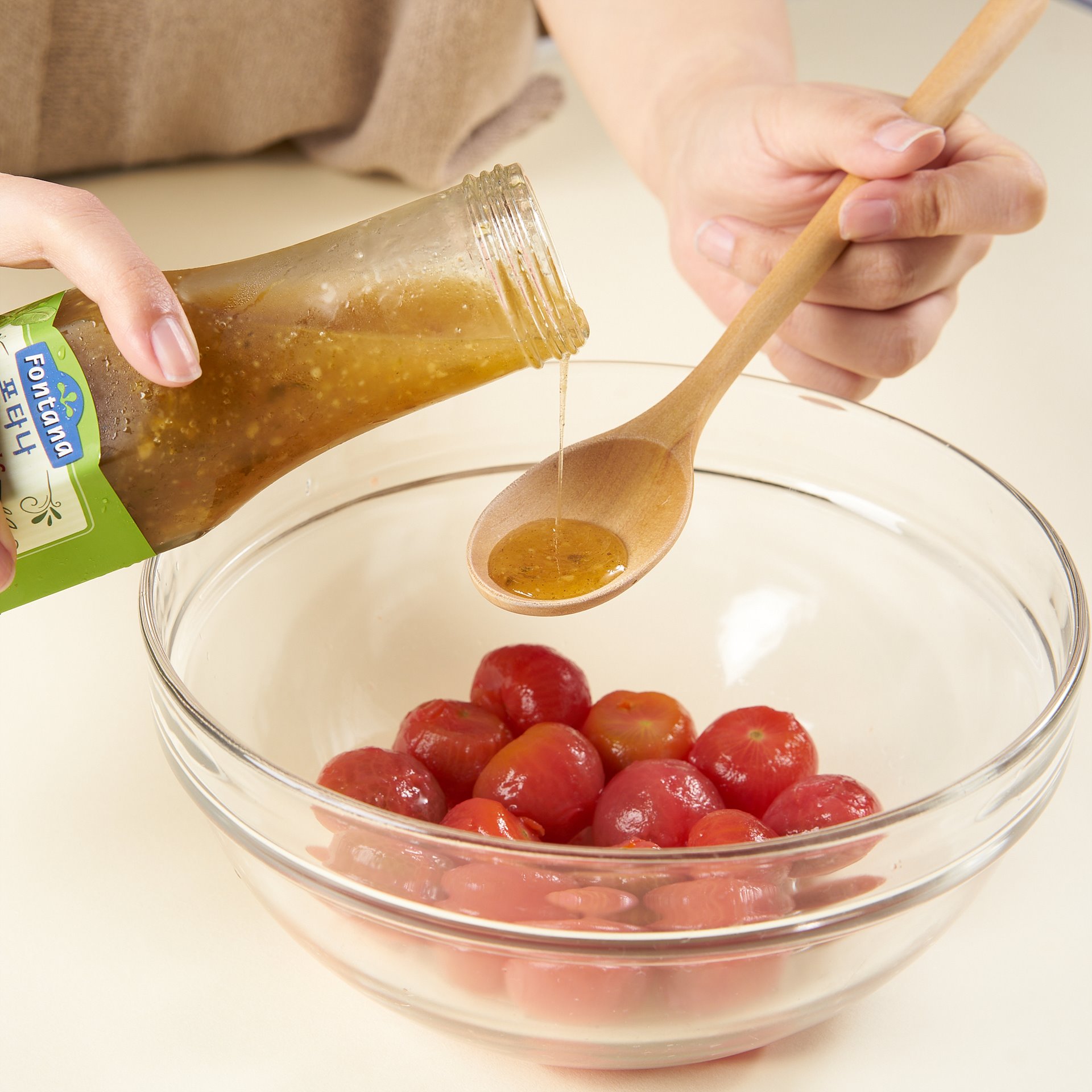 볼에 토마토를 넣고 이탈리안 드레싱과 함께 버무려주세요.​