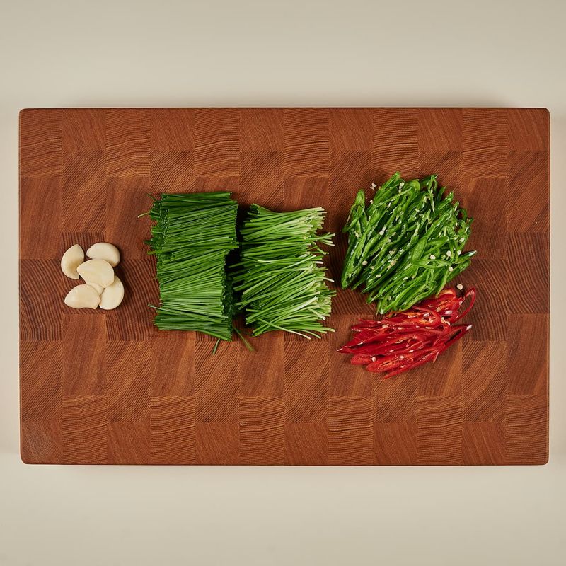부추는 세척 후, 물기를 제거하고 3~4cm 길이로 썰어 주세요. 마늘은 0.5cm 두께로 최대한 얇게 편썰고, 청양고추와 홍고추는 0.5cm 두께로 최대한 얇게 어슷 썰어 주세요.