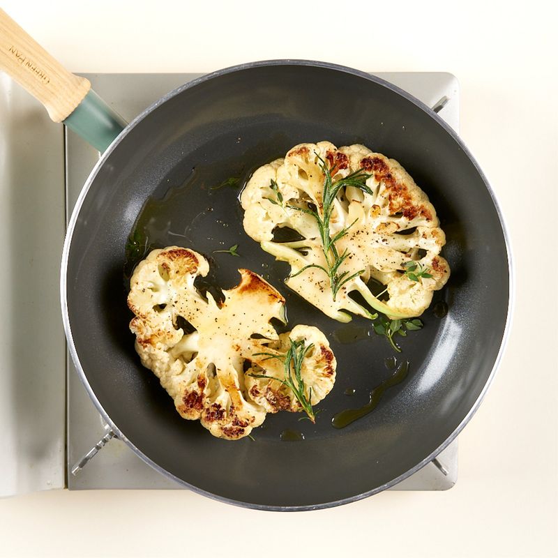 예열한 팬에 올리브유 2스푼을 두르고 콜리플라워를 올려 노릇노릇하게 구워주세요. 접시에 잘 구워진 콜리플라워를 담아 완성!