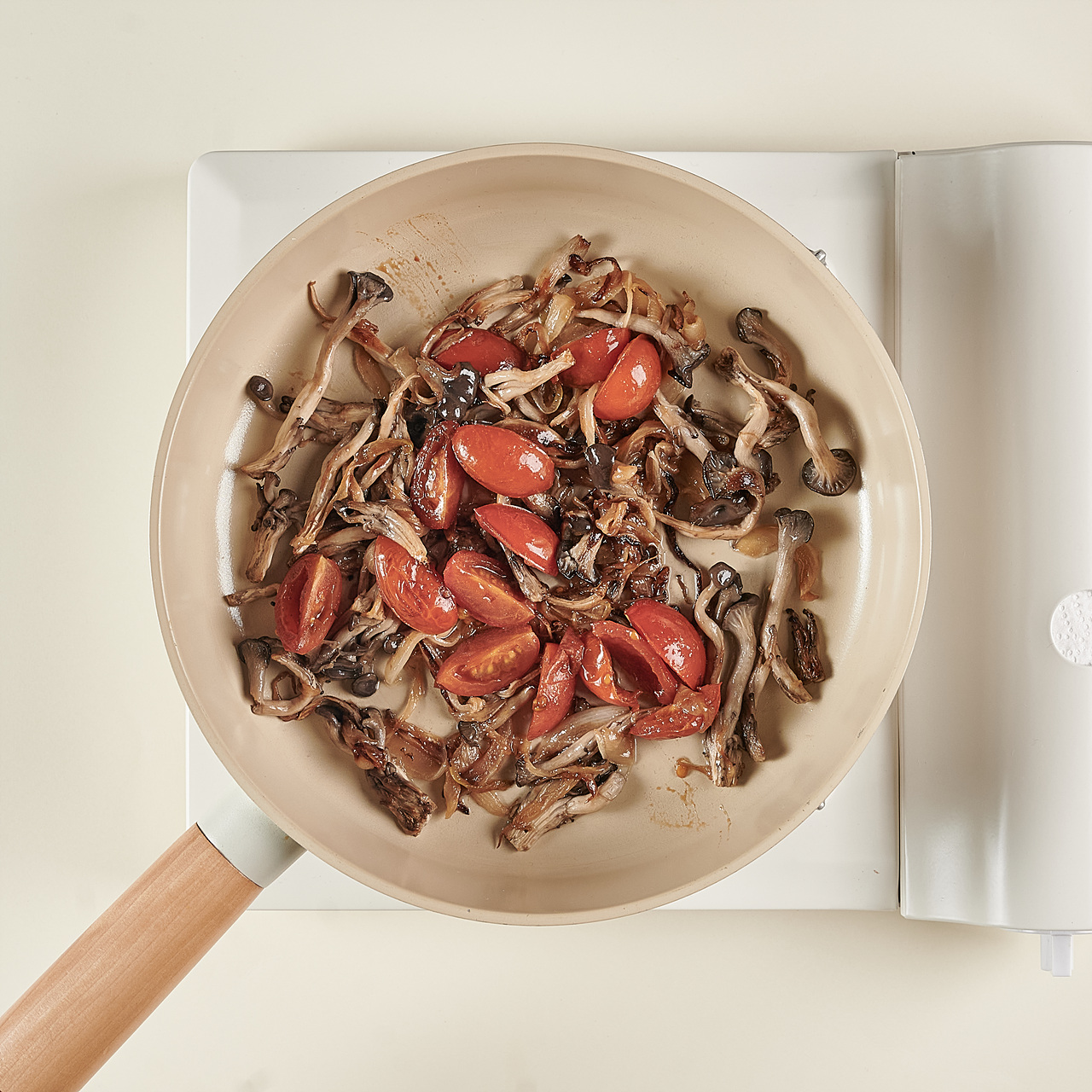 중불로 예열한 팬에 식용유를 넣고 양파와 버섯을 2분 동안 볶아주세요. 그 후, 토마토를 넣고 1분 정도 더 볶아 주세요.