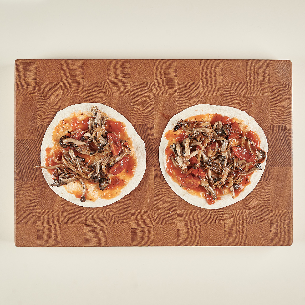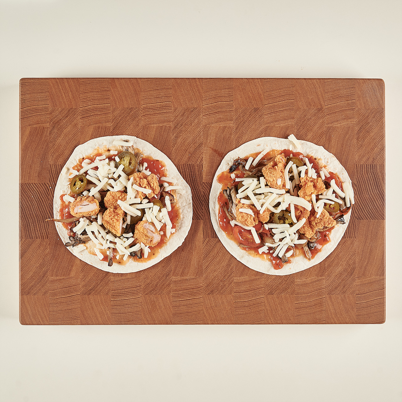 난(또띠아) 2장을 펼치고, 토마토 파스타소스를 각 2스푼씩 골고루 발라 주세요. 그 위에 볶은 재료와 치킨, 할라피뇨, 모짜렐라치즈를 각각 2스푼씩 올리고, 반으로 접어서 반달 모양을 만들어주세요.