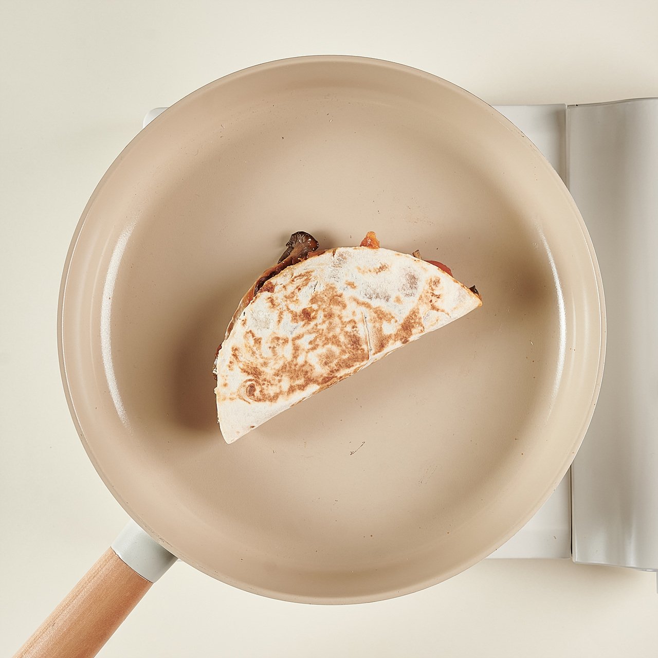 약불로 예열한 팬에 퀘사디아를 올려, 앞뒤로 1분씩 치즈가 녹을 때까지 뒤집어가며 구워주세요.