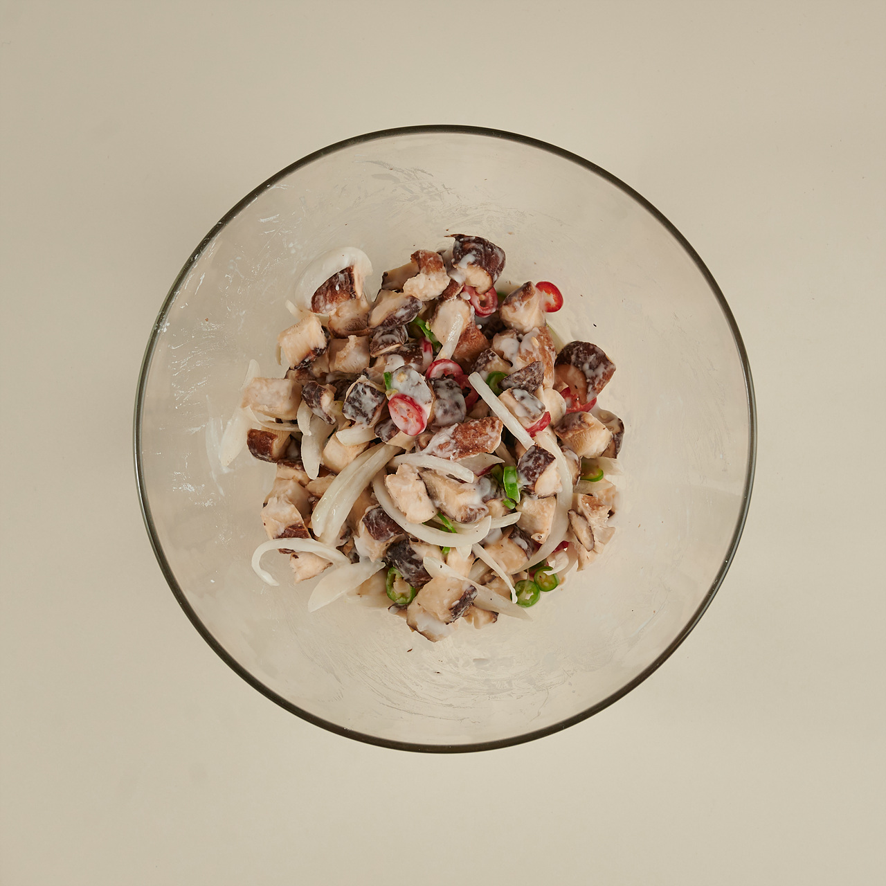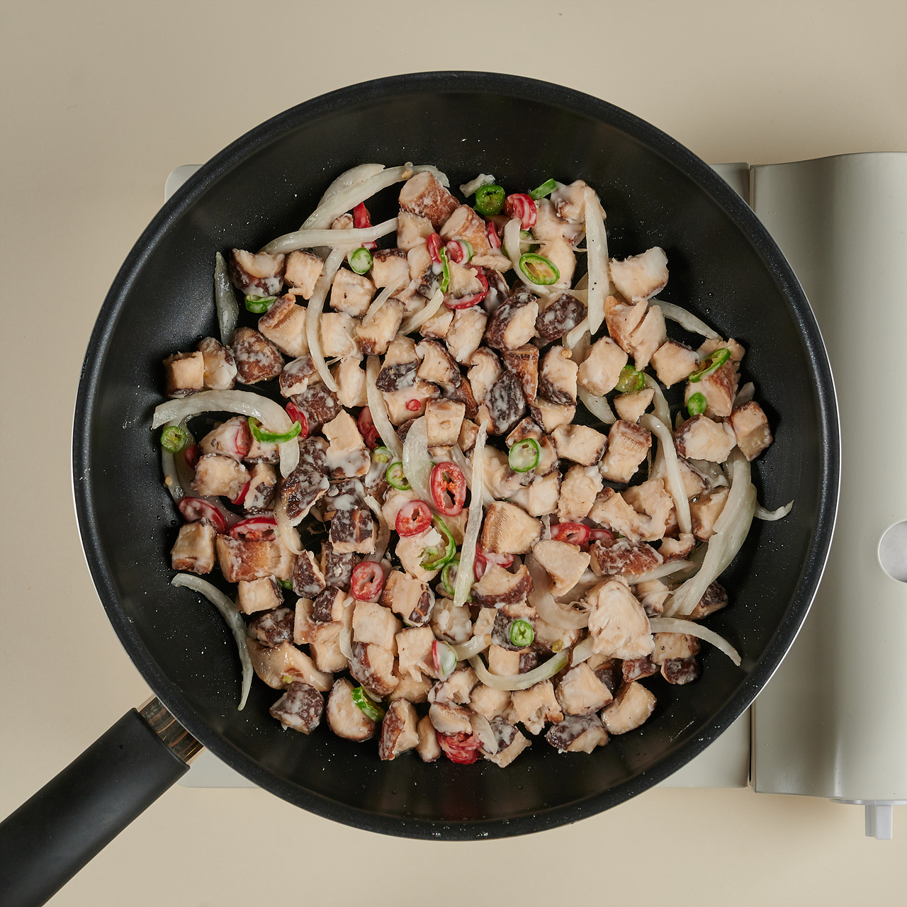 표고버섯은 밑동을 제거한 후, 사방 1cm 두께 주사위 모양으로 썰어주세요. 양파는 1cm 두께로 채 썰고, 청양고추와 홍고추는 1cm 두께로 송송 썰어 주세요.