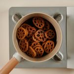 예열된 냄비에 식용유를 두른 후, 데친 연근을 넣어 중불에서 약 2분간 볶아 주세요.