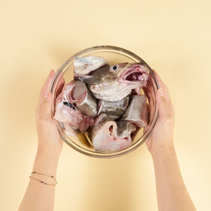 대구는 지느러미와 내장을 제거하고 4~5cm 크기로 토막내 주세요. 손질한 대구를 흐르는 물에 불순물이 없도록 세척해주세요.