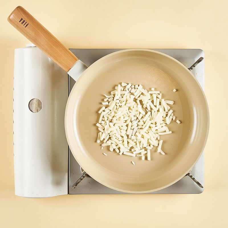 마른 팬에 모짜렐라 치즈를 빵 한쪽 면적만큼 펼쳐 올려준 후, 중불에서 한쪽면이 노릇할 때까지 (약 30초~1분간) 구워 주세요.