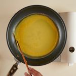 코팅한 팬은 약불로 줄여 약 1분간 더 예열한 후, 풀어둔 달걀물을 넣어 골고루 동그랗게 펴주세요. 표면의 덜 익은 달걀물이 보이지 않을 때까지 그대로 두어 조리하면 완성!