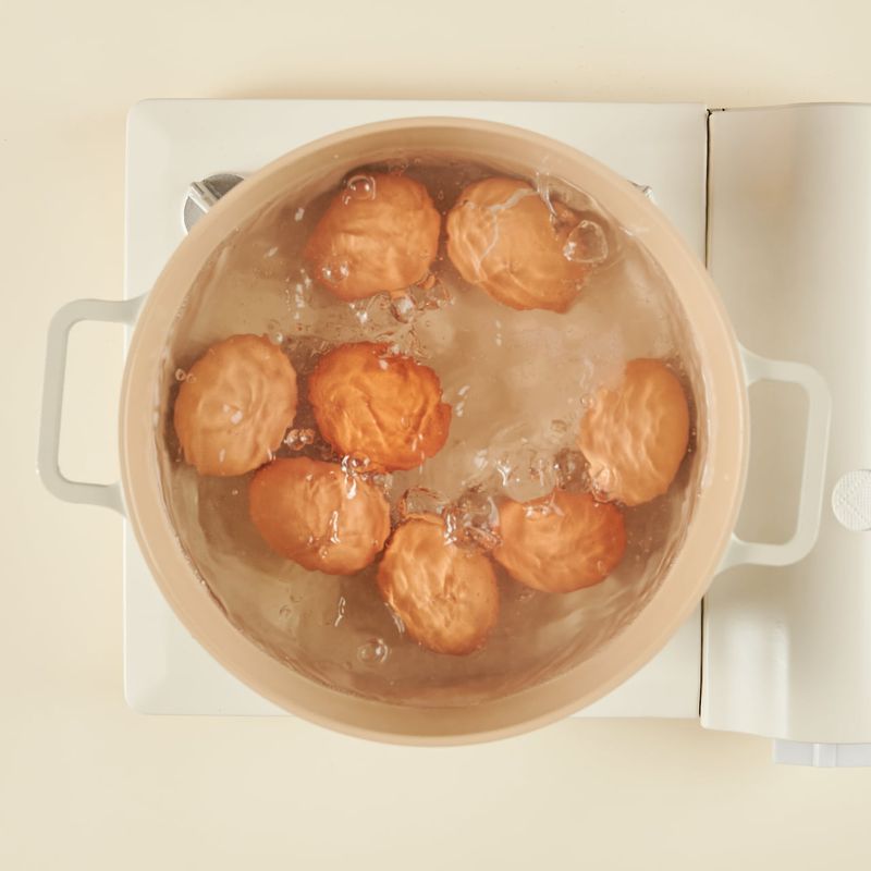 물 2L에 소금 1스푼을 넣고 끓여 주세요. 물이 바글바글 끓어오르면 달걀을 넣고 중불에 8분 동안 끓여주세요. (완숙 기준)