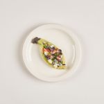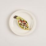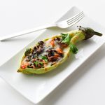 껍질 벗긴 가지는 통째로 내열용기에 담아 랩을 씌워 전레인지에 2분간 조리해주세요. (1,000W 기준) 세로로 칼집을 내어 반을 갈라 준비해둔 속재료를 넣고 모짜렐라 치즈로 덮어주세요. (랩을 씌우지 않고) 전자레인지에 1분 더 조리한 후, 마지막에 올리브유를 뿌리면 완성!