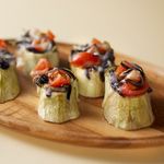가지피자 플레이팅, 다른 버전으로도 도전해보고 싶다면? 전자레인지로 1차 조리한 가지를 원형 통으로 한 입크기로 잘라주고, 속재료와 치즈를 올려 전자레인지에서 2차 조리해 주세요.