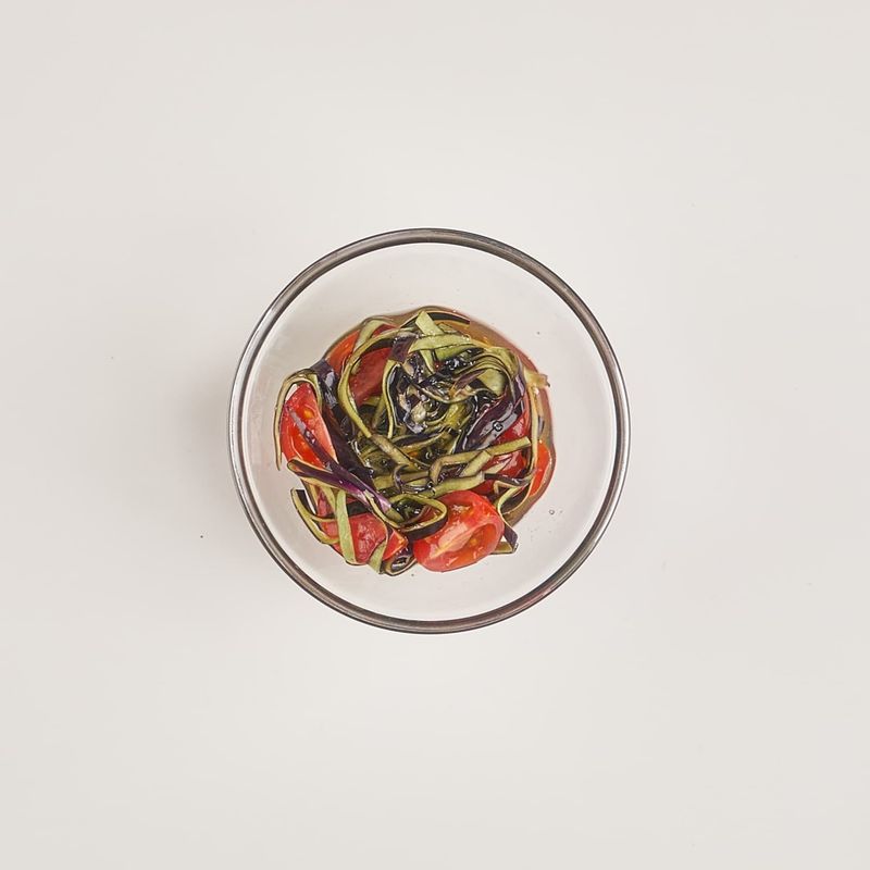 가지 껍질과 방울토마토, 연두순을 함께 버무려주세요.