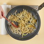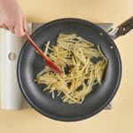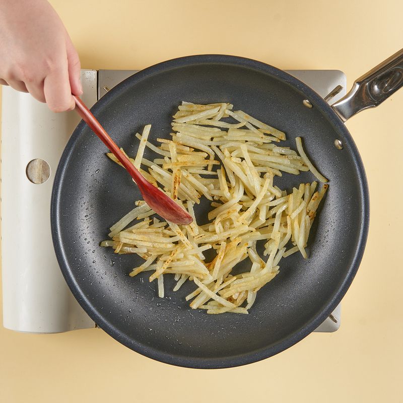 중불에서 예열한 팬에 식용유를 두르고 감자를 넣어 주세요. 약 5분간 감자가 골드브라운색이 날 때까지 볶아 준 후, 양파를 넣고 숨이 죽을 때까지 2분 가량 더 볶아주면 완성!