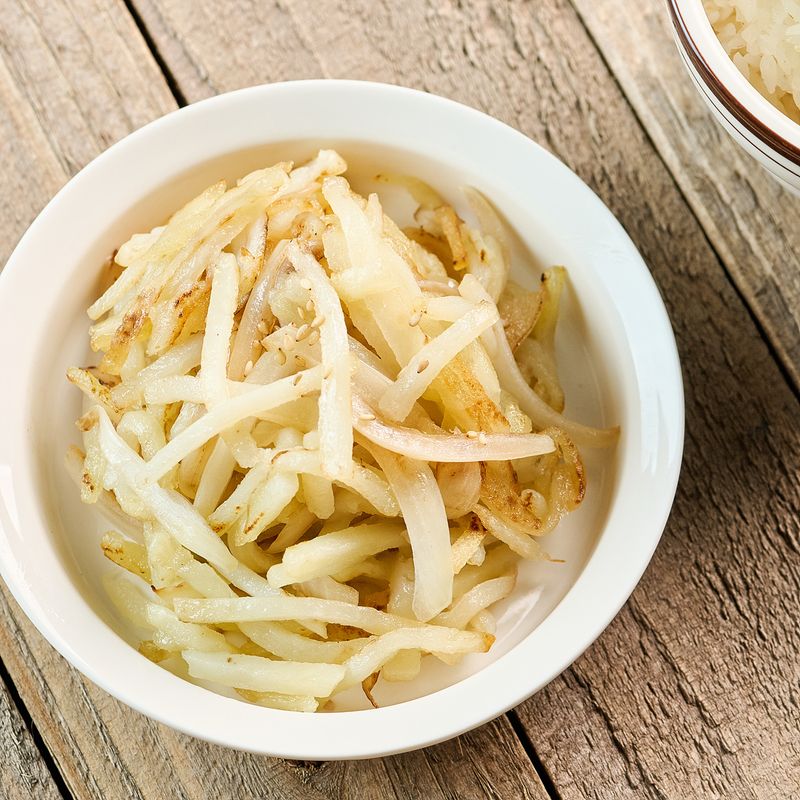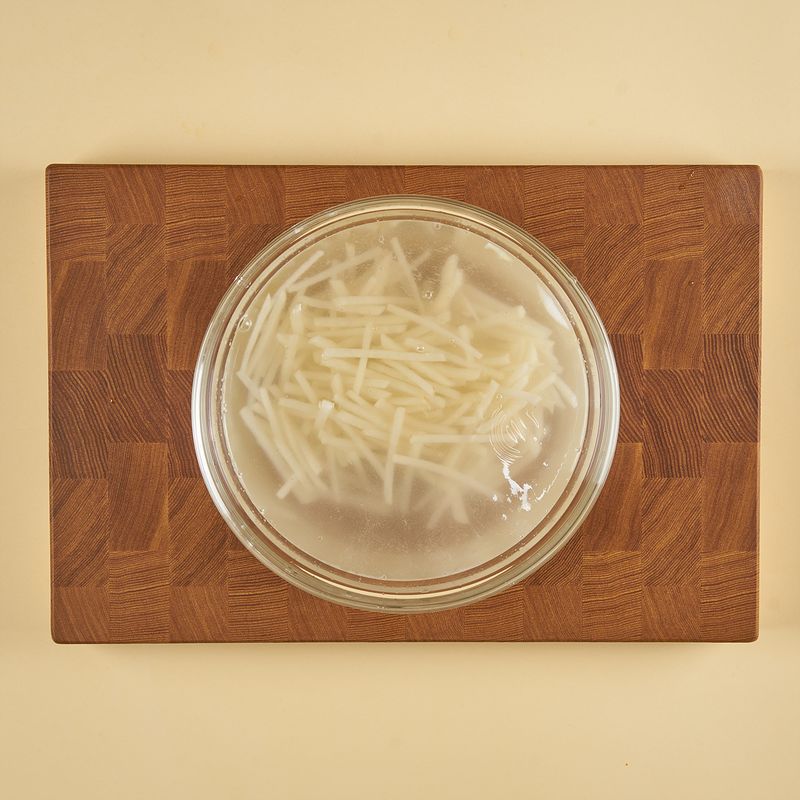 채 썬 감자는 볼에 담고 흐르는 물 혹은 찬물에 담아 여러 번 헹궈 주세요. 맑은 물이 나올 때까지 헹궈 감자의 전분을 제거해 주세요.
