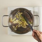 중강불로 예열한 냄비에 식용유를 두르고, 썰어둔 대파의 흰 부분만 넣어 약 1분간 볶아 파기름을 내 주세요. 파의 익은 향이 올라오면, 돼지고기를 넣고 표면이 갈색으로 변할 때까지 중강불에서 약 5분 볶아주세요.