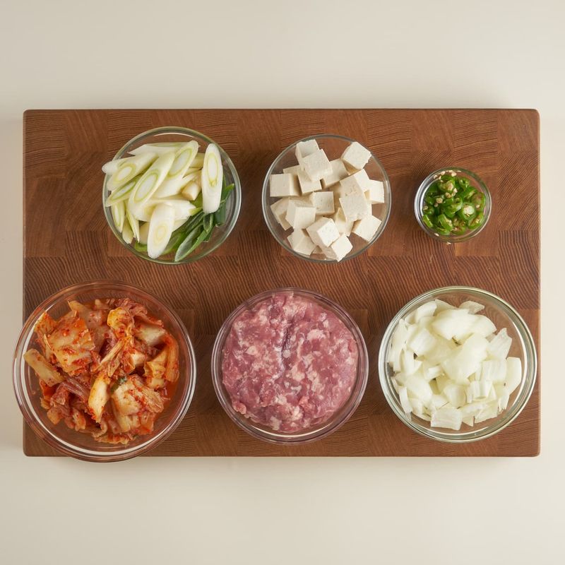 돼지고기 다짐육은 키친타올로 눌러 핏물을 가볍게 제거해 주세요. 양파, 두부는 사방 1cm 두께 큐브 모양으로 썰고, 대파는 어슷 썰어 주세요. 청양고추는 송송 썰어주세요. 김치는 사방 2cm 크기로 썰어 주세요. 감자는 0.5cm 두께로 크게 은행잎 모양으로 썰고 찬물에 약 5분간 담가 전분을 제거해 주세요.