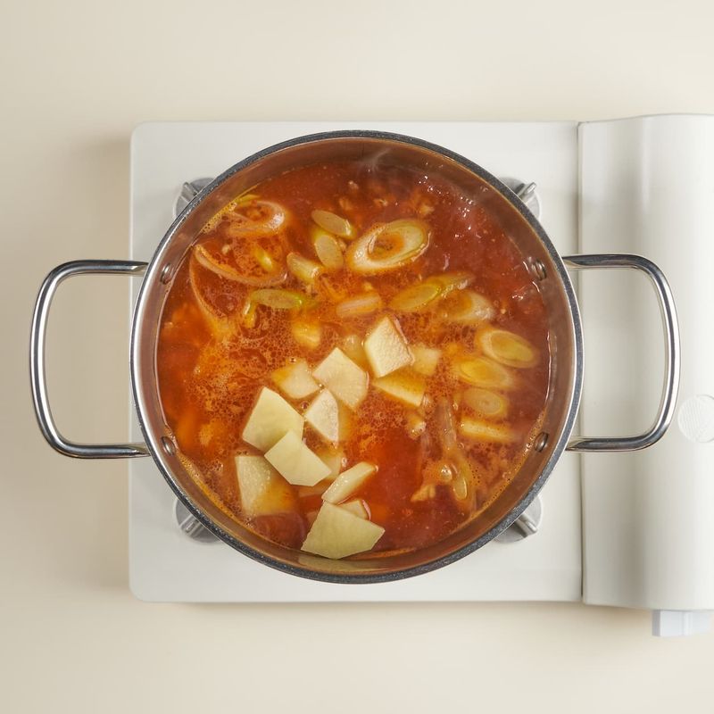 물이 끓어오르면 중불로 낮춰 감자를 넣고 4~5분 정도 먼저 끓여 준 후, 양파와 김치를 넣어 7분 정도 더 끓여 주세요. 두부, 대파(초록 부분), 청양고추를 넣고 2~3분 끓여주면 완성!