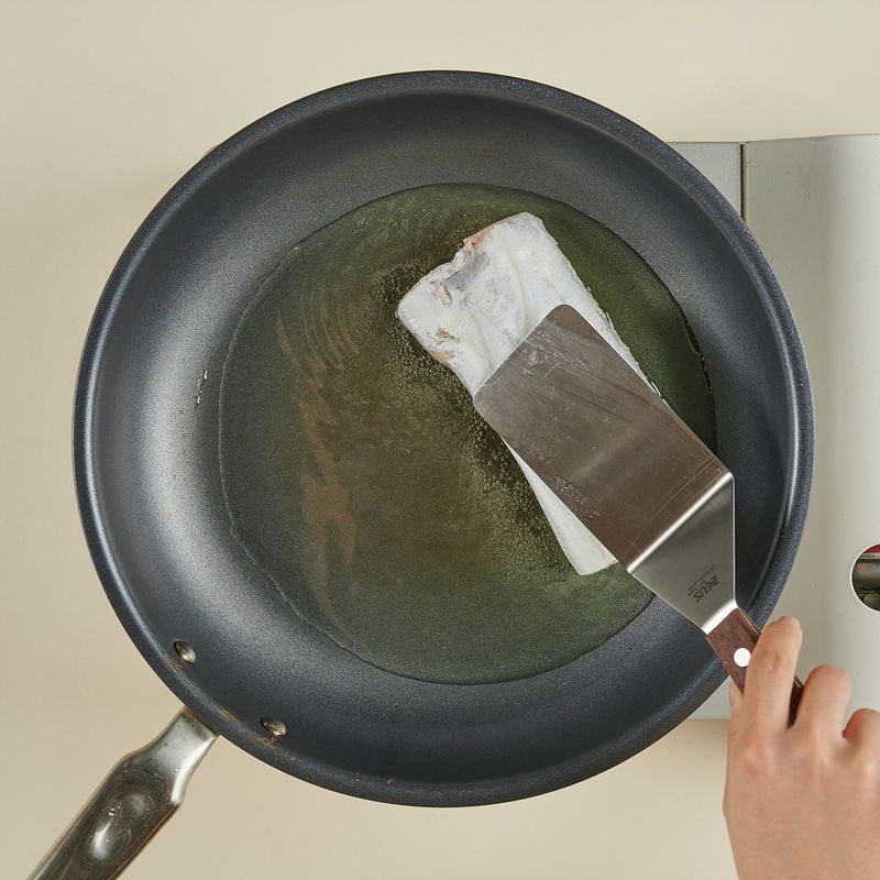 - 두께가 있는 두꺼운 갈치의 경우, 안까지 골고루 익을 수 있도록 팬을 기울여 기름에 충분히 잠길 수 있도록 해주세요.