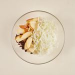 볼에 양념 재료(플레인요거트, 올리브유, 소금, 후추)를 넣고 잘 섞어 주세요. 손질한 양배추, 사과와 건포도를 넣고 가볍게 버무려주면 완성!