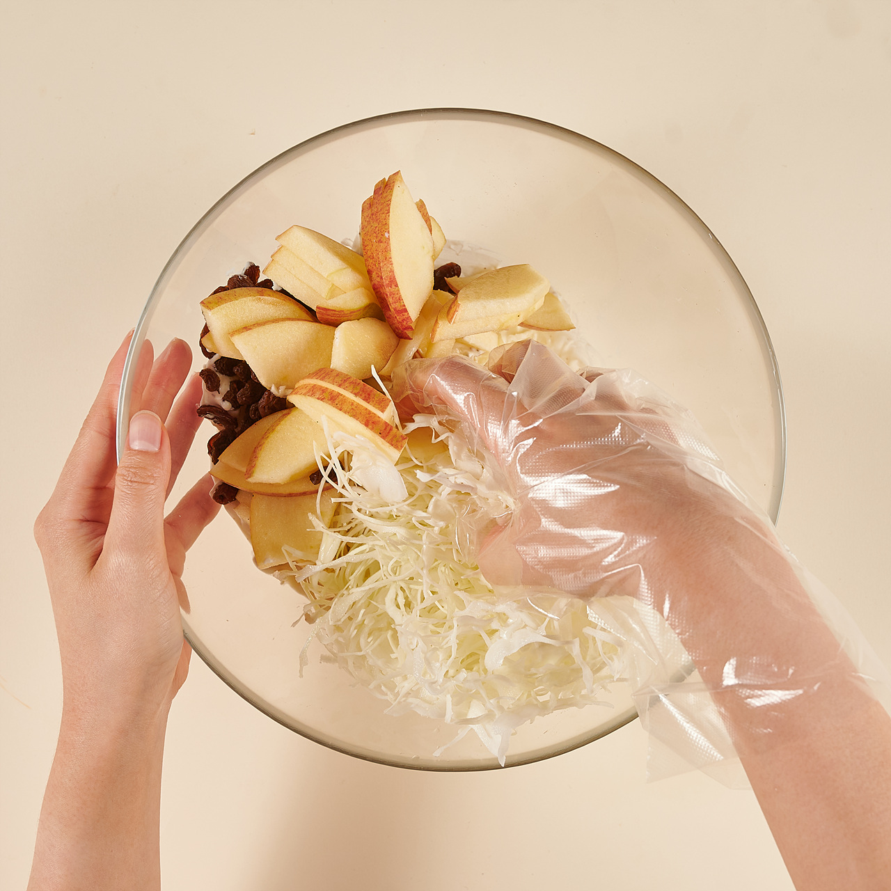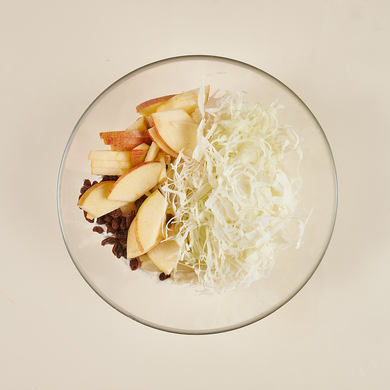 볼에 플레인요거트, 올리브유, 소금, 후추를 넣고 잘 섞어 주세요. 손질한 양배추, 사과와 건포도를 넣고 가볍게 버무려주면 완성!