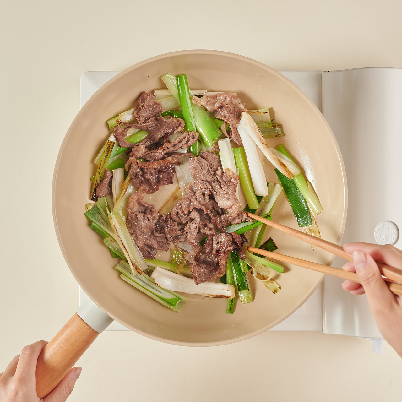 볶은 파 위에 차돌박이를 넣어 센불에서 2~3분 동안 갈색빛이 될 때까지 볶아주세요.