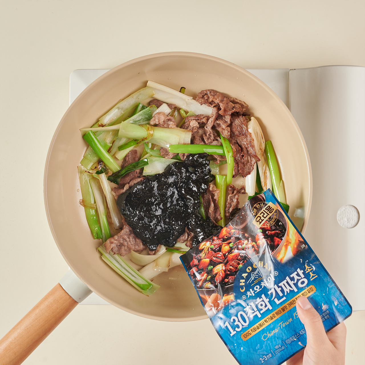 중불로 줄여 짜장소스, 물을 넣고 잘 섞어 주고, 다시 센불로 올려 데친 떡을 넣어 7분 동안 끓여주면 완성!