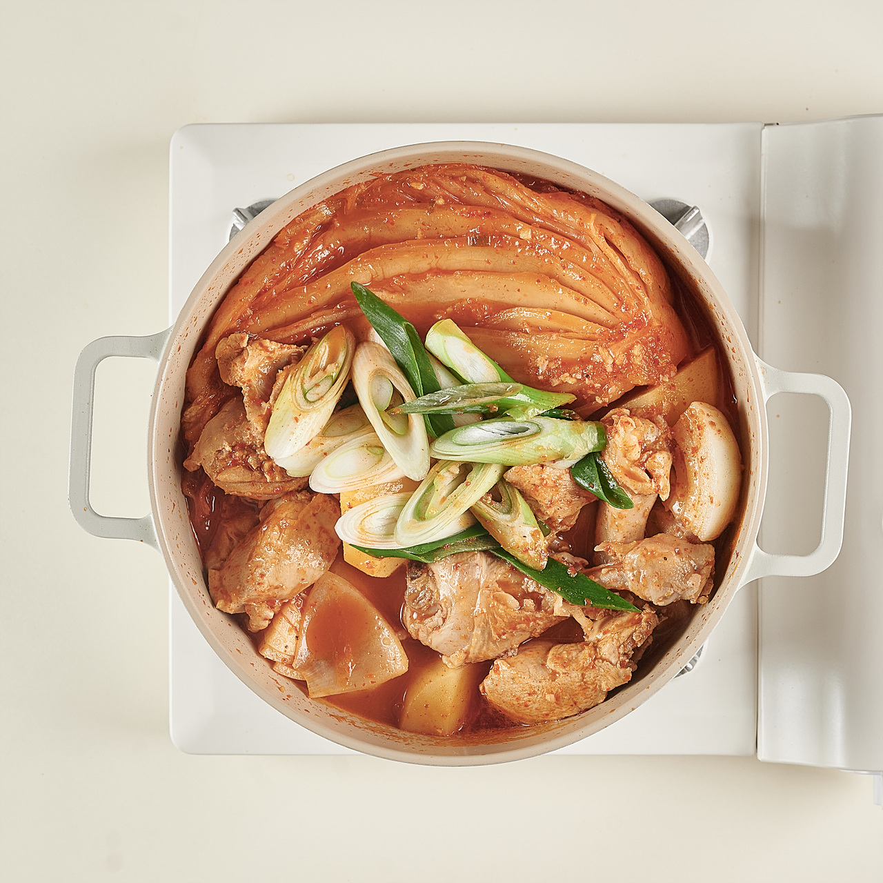 국물이 끓기 시작하면 중불로 줄이고 감자와 닭이 잘 익을 때까지 뚜껑을 덮고 20~30분 동안 더 끓여주세요. 손질한 대파와 양파를 넣고 5분 더 끓여주면 완성!