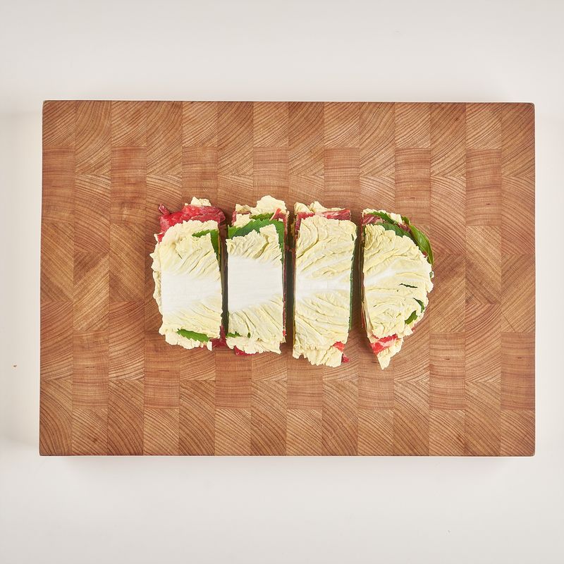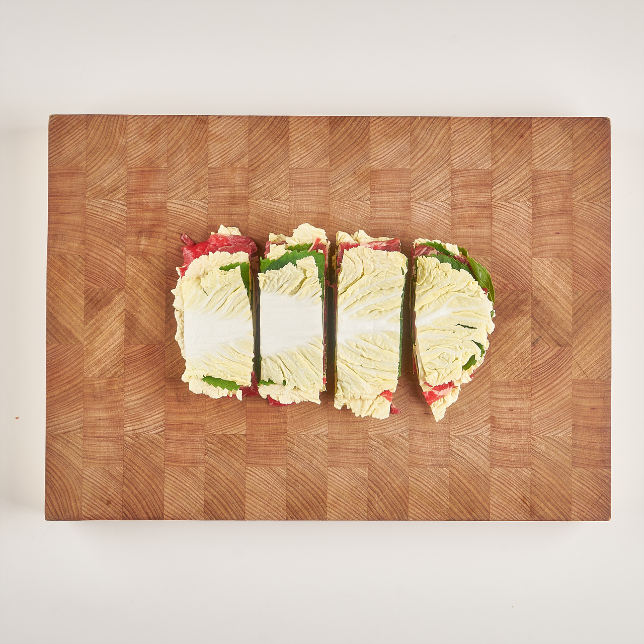 초록 깻잎, 노란 배추, 빨간 고기, 하얀 버섯을 겹치면